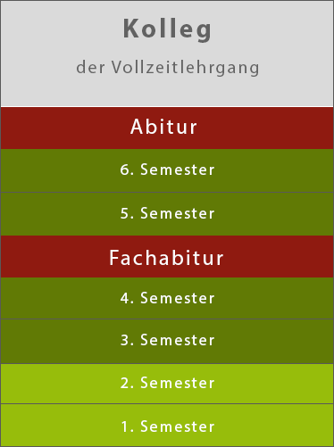 Der Bildungsgang Kolleg bietet bildungswilligen Erwachsenen mit beruflicher Erfahrung die Chance, innerhalb von zwei Jahren das Fachabitur bzw. innerhalb von drei Jahren das Vollabitur in Vollzeit zu erwerben.